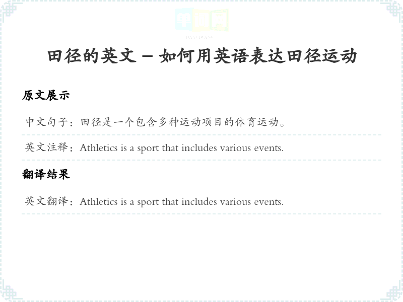 通过本篇文章的学习,希望你能够对"田径是一个包含多种运动项目的体育运动。"这个词的翻译及相关用法有一个全面的理解,并在实际应用中灵活运用。