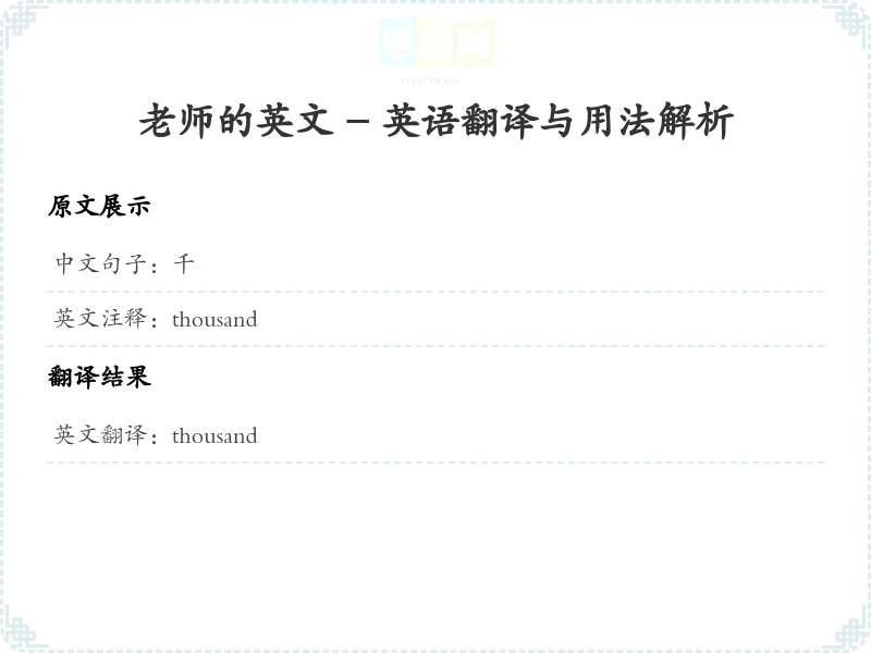 - 在翻译数字时,通常直接使用阿拉伯数字的英文表达。对于'千',其英文表达是'thousand'。