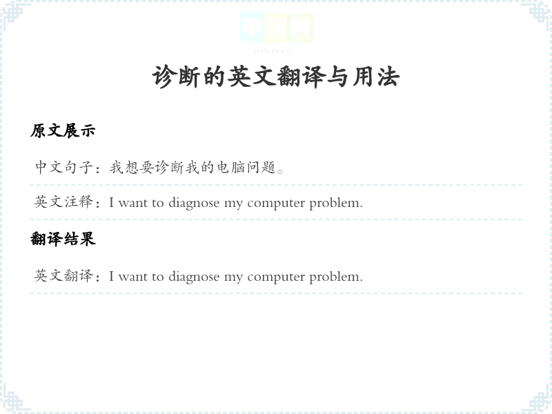 - 在这句中,'诊断'译为'diagnose',表示对问题的识别和分析。'电脑'直接翻译为'computer',而'问题'则译为'problem',构成了清晰的意思表达。