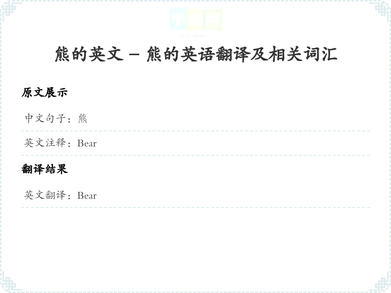 - 这个词是一个名词,直接翻译成英语的 'Bear',没有复杂的结构,意思清晰明了。