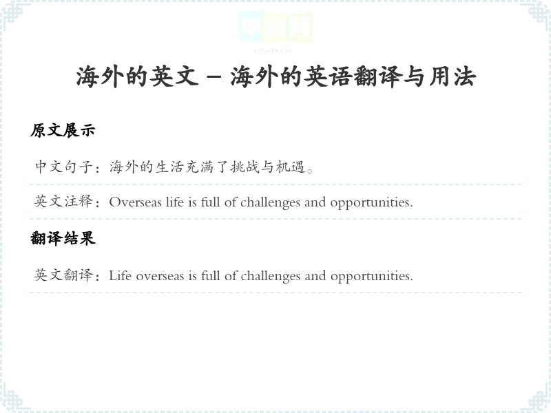 通过本篇文章的学习,希望你能够对"海外的生活充满了挑战与机遇。"这个词的翻译及相关用法有一个全面的理解,并在实际应用中灵活运用。