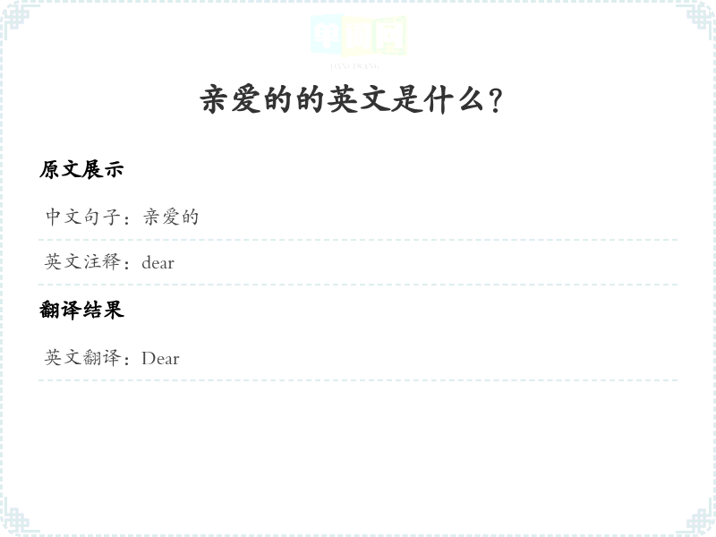 - 在翻译‘亲爱的’这个词时,我们需要考虑其在不同上下文中的含义。通常用于称呼亲密的人,如朋友、家人或恋人。该词在英文中一般对应为‘Dear’,常用于书信或亲密的对话中。