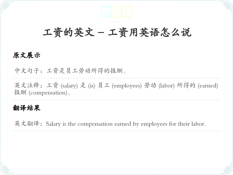 英文注释: 工资 (salary) 是 (is) 员工 (employees) 劳动 (labor) 所得的 (earned) 报酬 (compensation)。