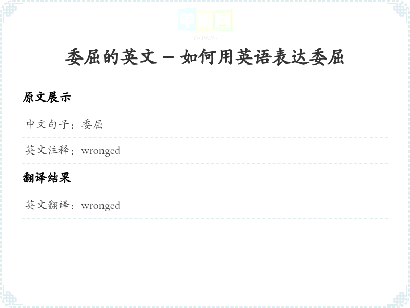 - 在翻译'委屈'时,考虑到中文的情感表达,该词通常用于描述一种不公正的感受。因而选择'wronged'作为翻译,能够准确传达其内涵。