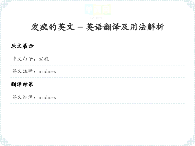 - 翻译时,考虑到‘发’可以表示‘发生’或‘变得’,而‘疯’则是‘精神失常’的意思,因此整体翻译为‘madness’。