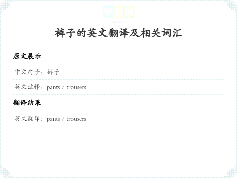 - 在翻译过程中,'裤子'的英文翻译主要为'pants'或'trousers',具体选择依赖于地区的语言习惯。美国英语中常用'pants',而在英国英语中则更常用'trousers'。