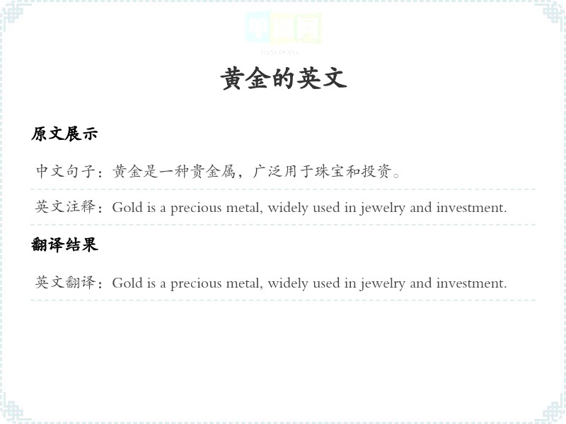 通过本篇文章的学习,希望你能够对"黄金是一种贵金属,广泛用于珠宝和投资。"这个词的翻译及相关用法有一个全面的理解,并在实际应用中灵活运用。