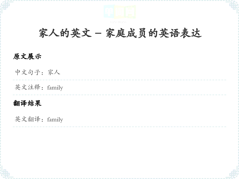 - 在翻译过程中,'家人'被直接翻译为'family',因为这是该词在英语中的标准翻译,意义清晰且通用。