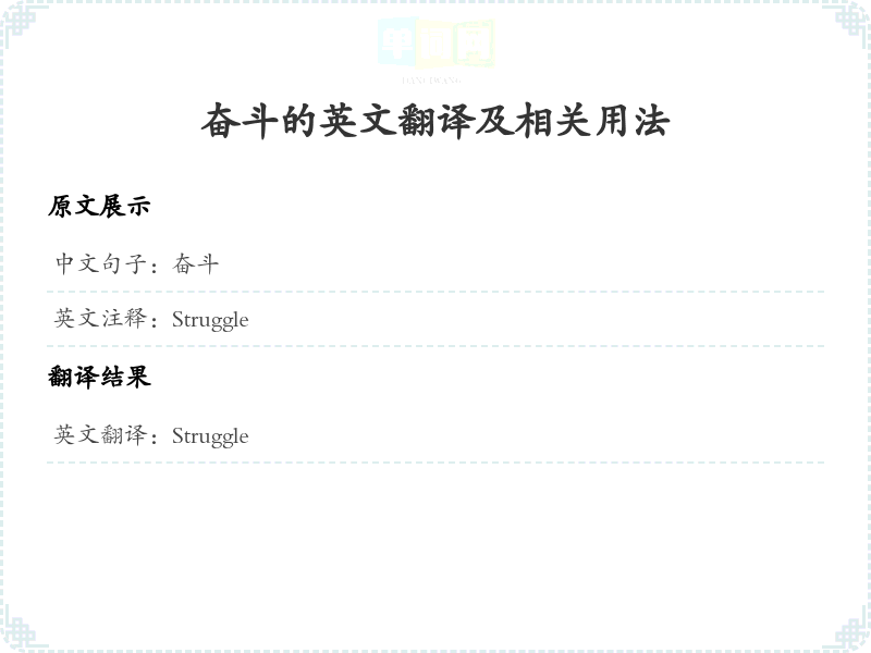 - 该词在中文中表示努力追求目标或克服困难的过程。在翻译时,选择'奋斗'的英文对应词'Struggle',能够准确传达其内涵和情感色彩。
