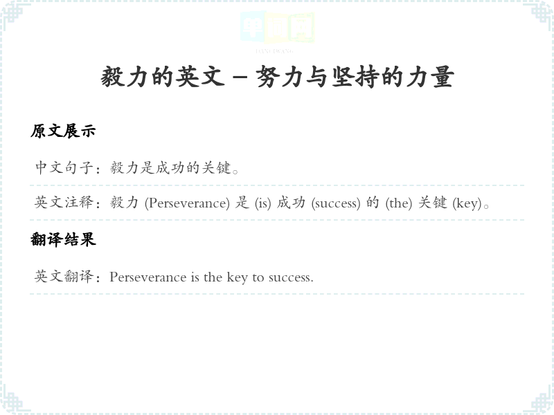英文注释: 毅力 (Perseverance) 是 (is) 成功 (success) 的 (the) 关键 (key)。