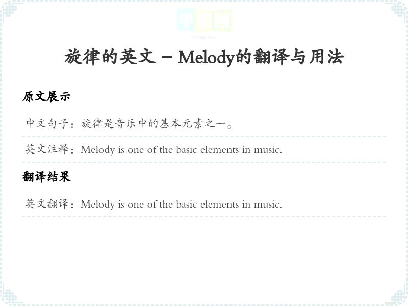 通过本篇文章的学习,希望你能够对"旋律是音乐中的基本元素之一。"这个词的翻译及相关用法有一个全面的理解,并在实际应用中灵活运用。