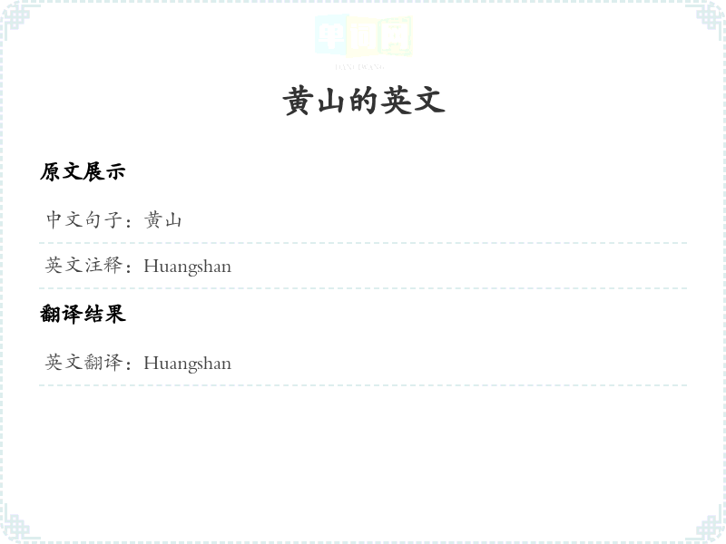 - 本句'黄山'翻译为'Huangshan',是一个地名,翻译时保留了其原有的音译形式,没有进行意译。