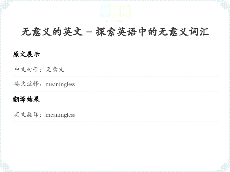 通过本篇文章的学习,希望你能够对"无意义"这个词的翻译及相关用法有一个全面的理解,并在实际应用中灵活运用。