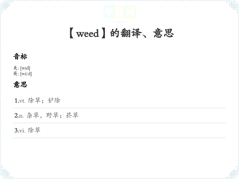 通过以上结构,可以全面理解和掌握单词 "weed" 的用法与含义。