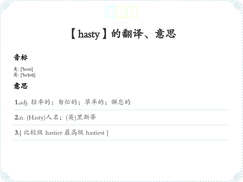 - 字面意思: "Hasty" 是一个形容词,表示匆忙、急促或草率的行为或态度。它通常用来形容由于缺乏深思熟虑而做出的决定或行动。