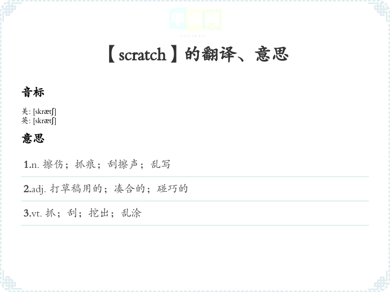 - 音标记忆法:Scratch的音标为 /skrætʃ/,可以通过发音与“抓”的声音相联系,加深记忆。