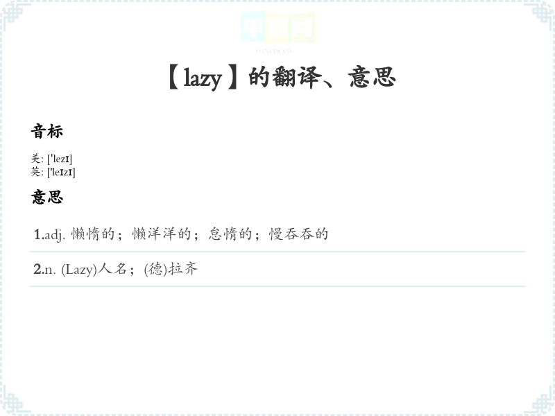- 谐音联想记忆:将lazy联想为“雷子”(懒惰的人),帮助记忆其含义。