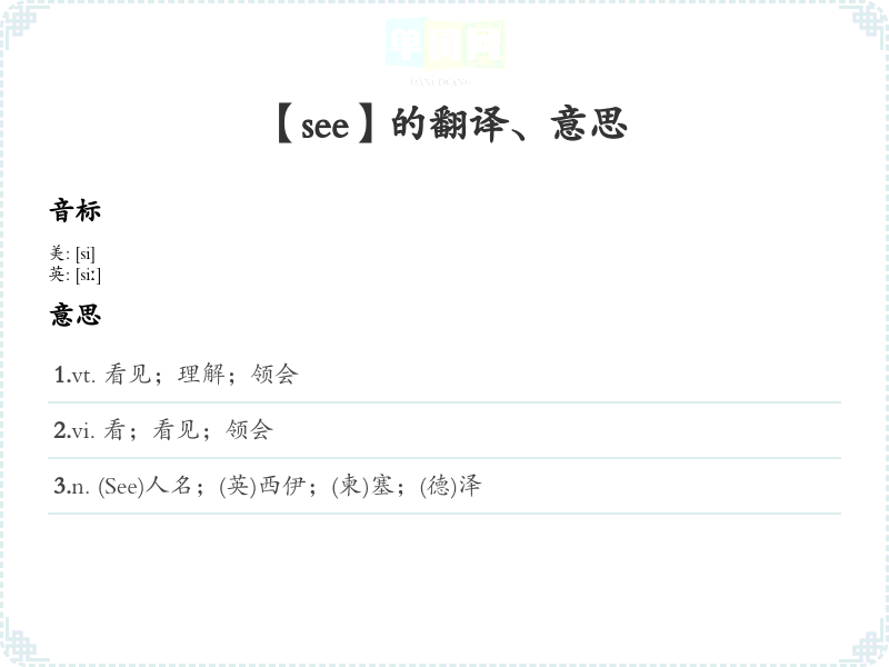 2.vi. 看;看见;领会 3.n. (See)人名;(英)西伊;(柬)塞;(德)泽