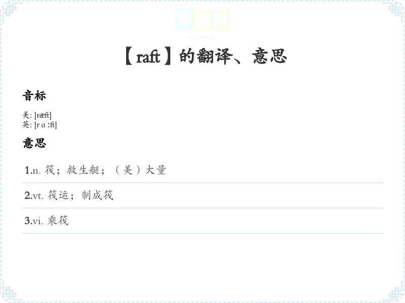 以上内容为“raft”这个单词的详细分析,涵盖了其定义、词源、使用场景以及学*方法等方面。希望这些信息能帮助你更好地理解和记忆这个单词!