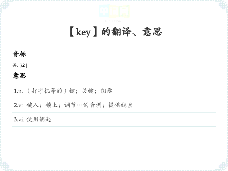 4.adj. 关键的 5.n. (Key)人名;(英)基;(德、荷、瑞典)凯