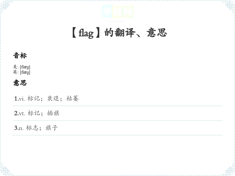 - 词根记忆法:虽然flag没有明显的词根,但可以记住“flag”与“飘动”相关的概念。