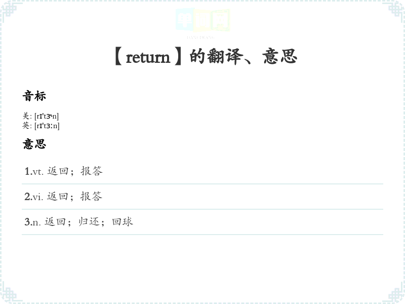 - 词性:动词(verb)和名词(noun)。作为动词时,表示“返回”;作为名词时,表示“归还”或“回报”。