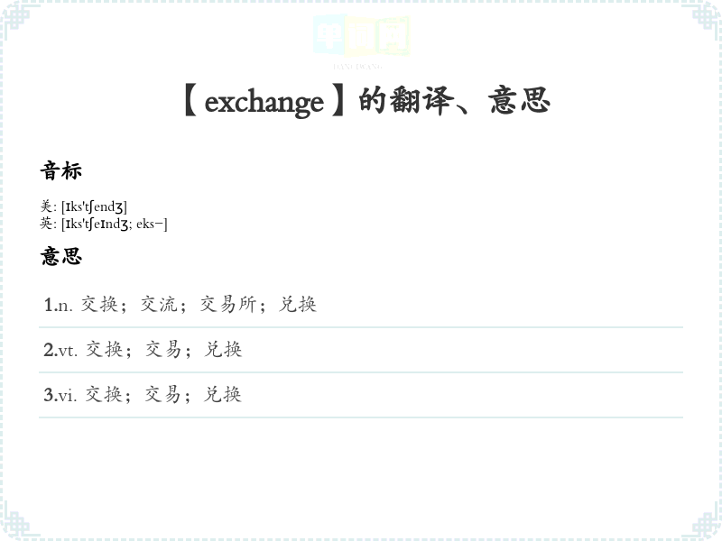 - 谐音联想记忆:可以联想“ex+change”寓意“前任的交换”,帮助记忆这个词。
