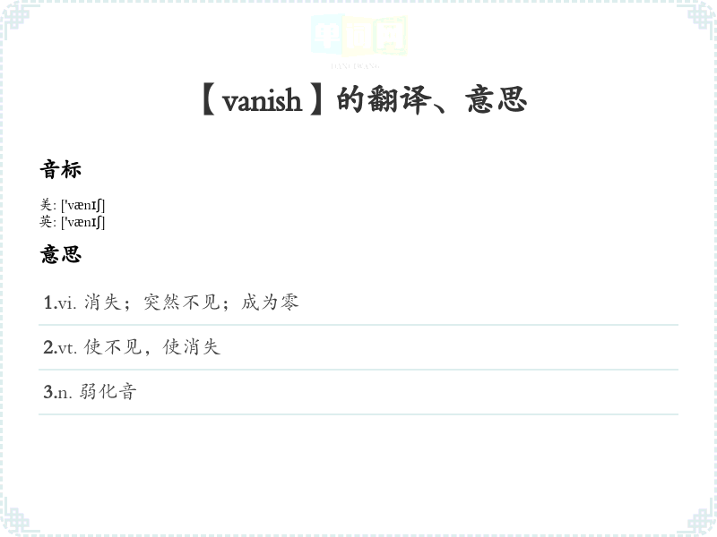 音标记忆法:/ˈvænɪʃ/,可以通过反复朗读这个音节来加强记忆,联想“van”与“消失”的意思。