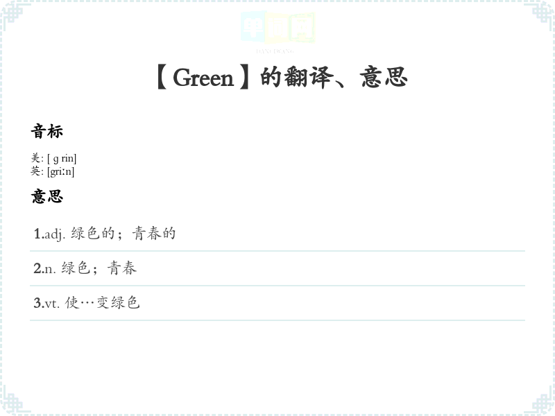 - 谐音联想记忆:可以联想汉字“绿”的发音,从而记住 "green" 的含义。