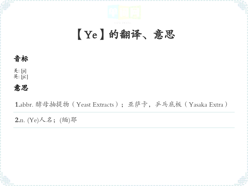 1.abbr. 酵母抽提物(Yeast Extracts);亚萨卡,乒乓底板(Yasaka Extra) 2.n. (Ye)人名;(缅)耶