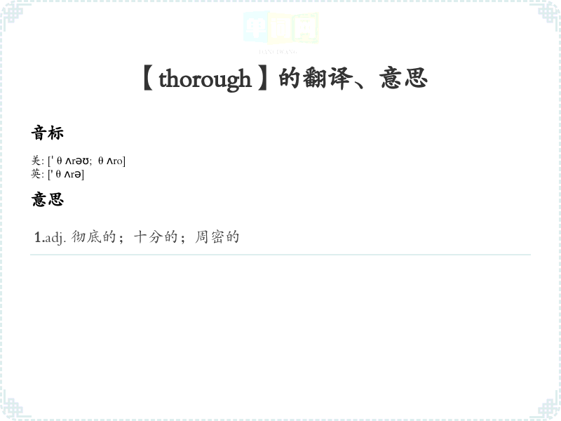 - 记住“thorough”源于古英语的“through”,可以联想到“完全通过某事”,帮助理解其意图。