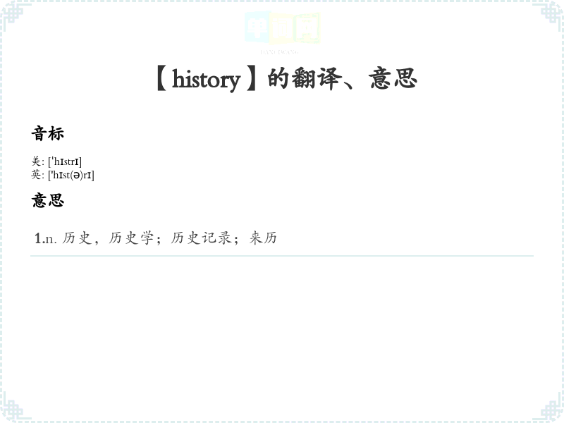 - 音标记忆法:通过记住 /ˈhɪstəri/ 的发音,联想 "his story"(他的故事),帮助理解历史是关于过去的故事。