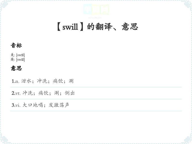 通过这些分析和示例,用户可以更深入地理解“swill”这个词及其使用方式。