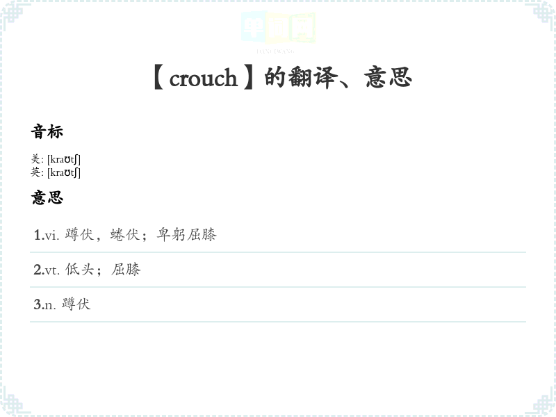 - 音标记忆法:crouch的音标为 /kraʊtʃ/,可以通过重复发音来加深记忆。在发音时,可以联想“像只猫一样蹲下(crouch)”。