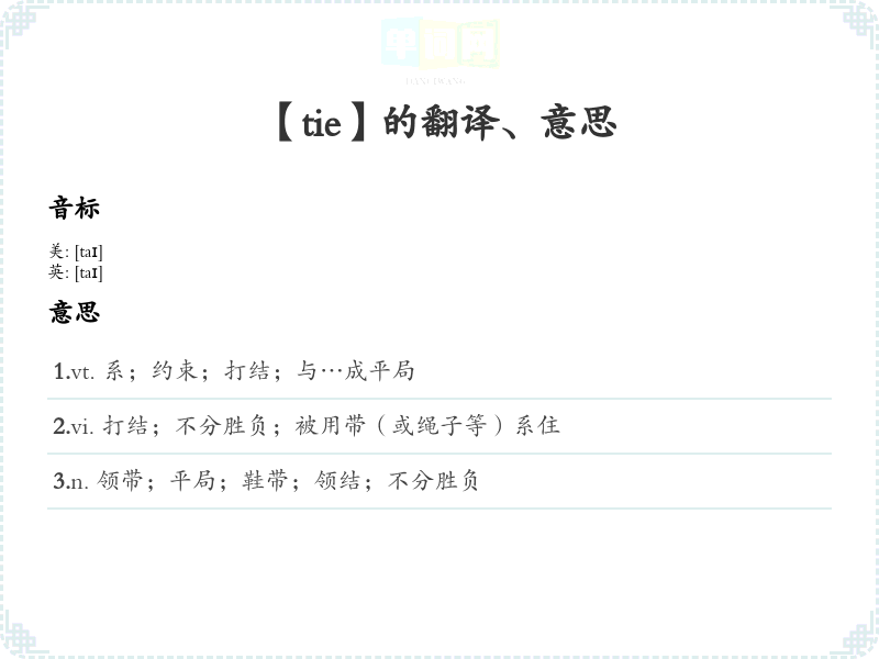 3.n. 领带;平局;鞋带;领结;不分胜负 4.n. (Tie)人名;(东南亚国家华语)治;(英)泰伊;(柬)狄