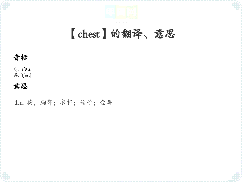 - “chest”字面上指的是一个大箱子,通常用于存放物品,也可以指人体的胸部。