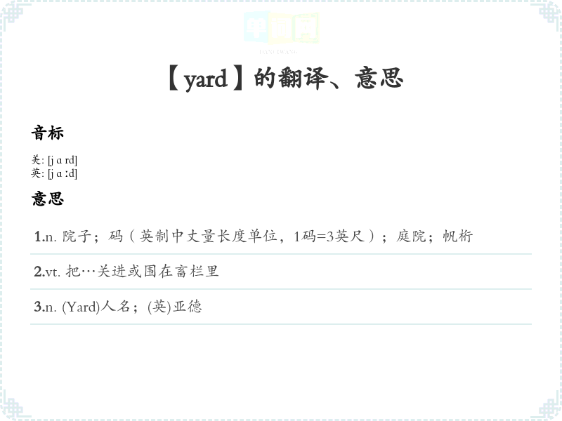 - yard的音标为/ jɑːrd /。可以通过音节的重复来记忆,比如将“yard”和“guard”进行联想,记住它的发音和含义。