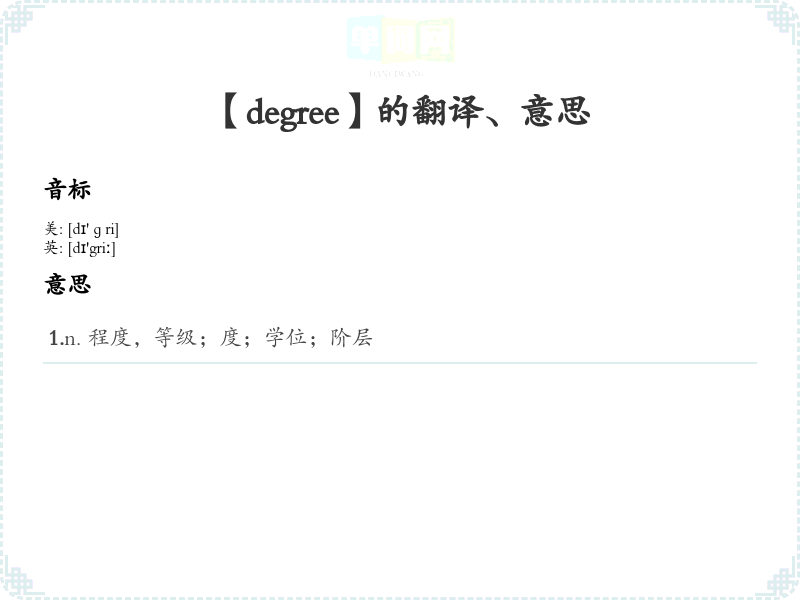 - 词根记忆法:学*“degree”时,可以记住它的词根“gradus”,联想到“步伐”或“层次”,这可以帮助记住它与程度、顺序相关的含义。