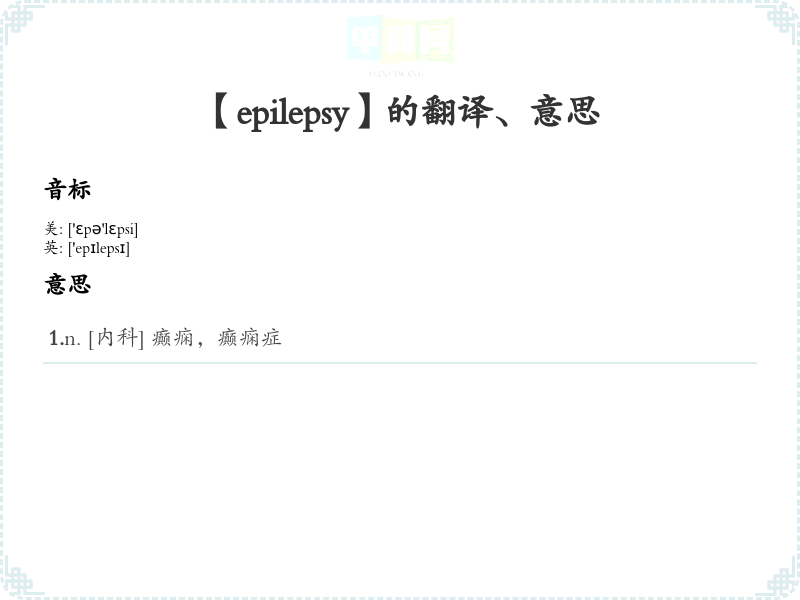 - 字面意思:Epilepsy(癫痫)是指一种神经系统疾病,特征为反复发作的癫痫发作,通常伴有意识丧失和身体抽搐。