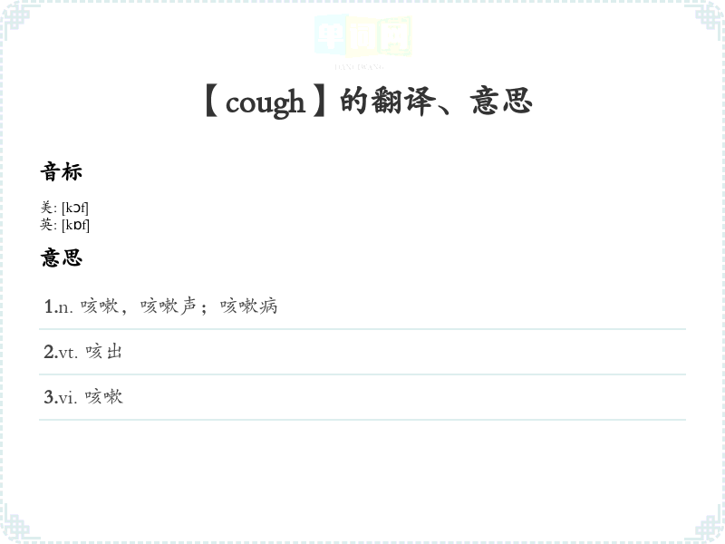 - Cough 的音标是 /kɔːf/。可以通过分解音节来记忆:发音时注意“k”音和“ɔːf”的结合,联想与咳嗽相关的动作和场景。