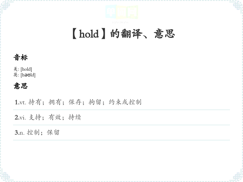 - 谐音联想记忆:将hold与“后”等谐音词联系在一起,想象自己在“后面”紧紧抓住什么。