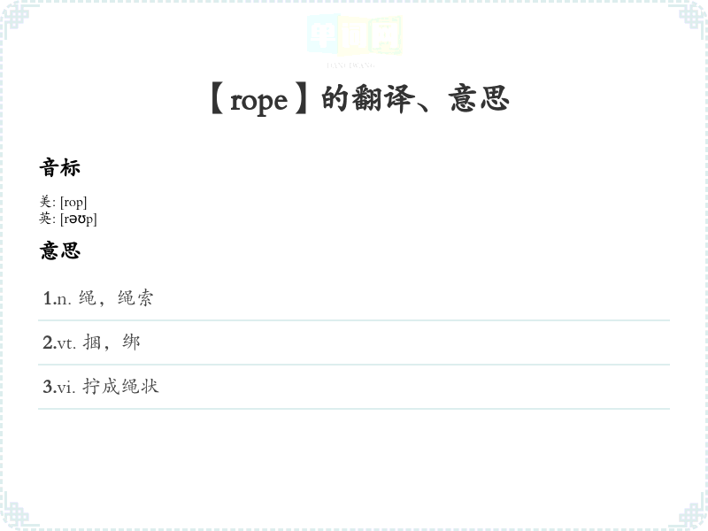 音标记忆法:可以通过音标记忆“rope”的发音 /roʊp/,与“hope”联想,想象用绳子拉住希望的感觉,帮助记忆。