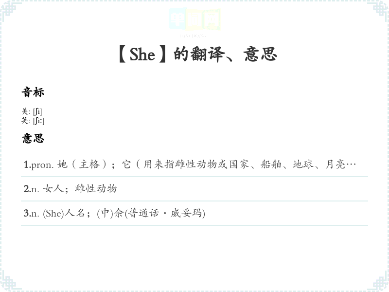 “She” 是一个第三人称单数女性代词,用于指代女性或被视为女性的人。 - 词性: