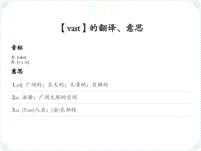 - VAST /væst/:可以将音节分解为/v/(发音时唇部接触)、/æ/(类似于“啊”)和/st/(发音时舌尖抬起),通过反复读音,加深对单词的记忆。