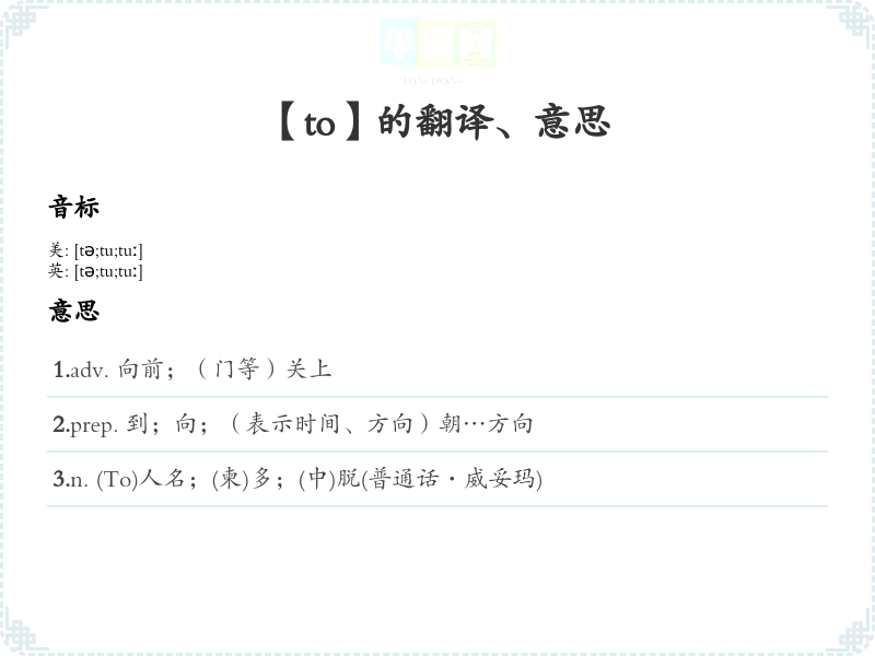 2.prep. 到;向;(表示时间、方向)朝…方向 3.n. (To)人名;(柬)多;(中)脱(普通话·威妥玛)