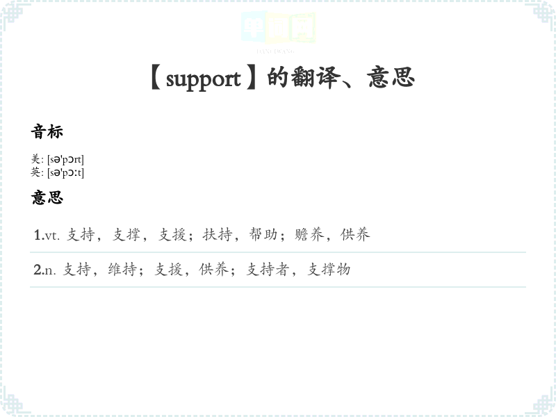 1.vt. 支持,支撑,支援;扶持,帮助;赡养,供养 2.n. 支持,维持;支援,供养;支持者,支撑物