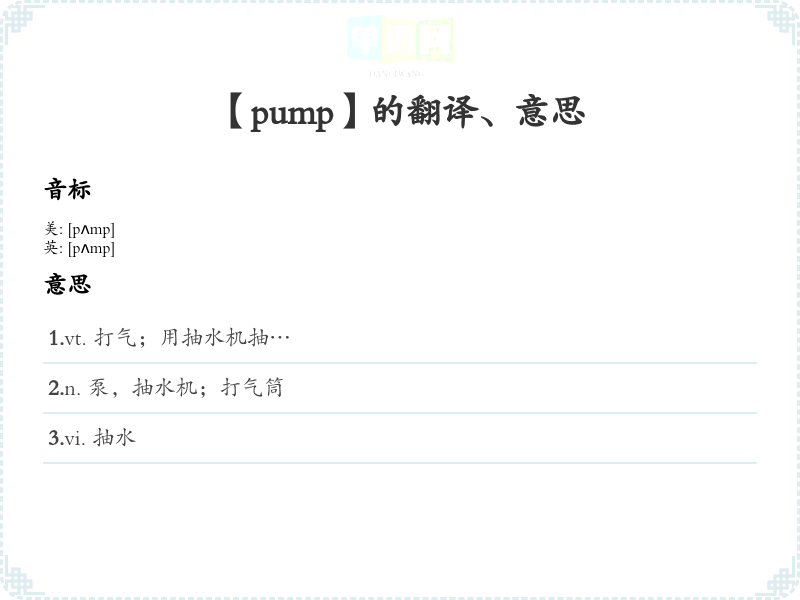 - 音标记忆法:Pump的音标是/pʌmp/,可以通过重复发音来加深记忆。