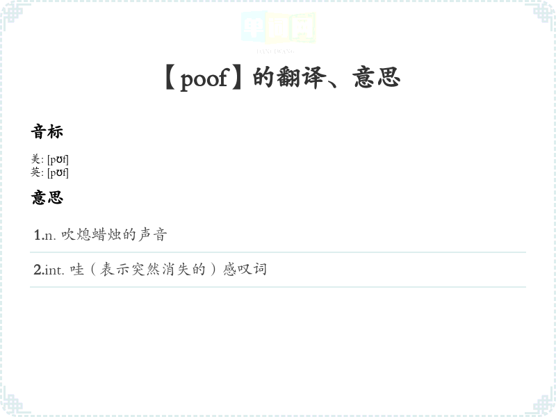 - 谐音联想记忆:将“poof”联想为“扑飞”,想象某样东西突然扑通一声飞走或消失。