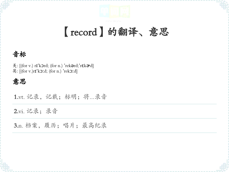 英[(for v.)rɪˈkɔːd; (for n.) ˈrekɔːd]