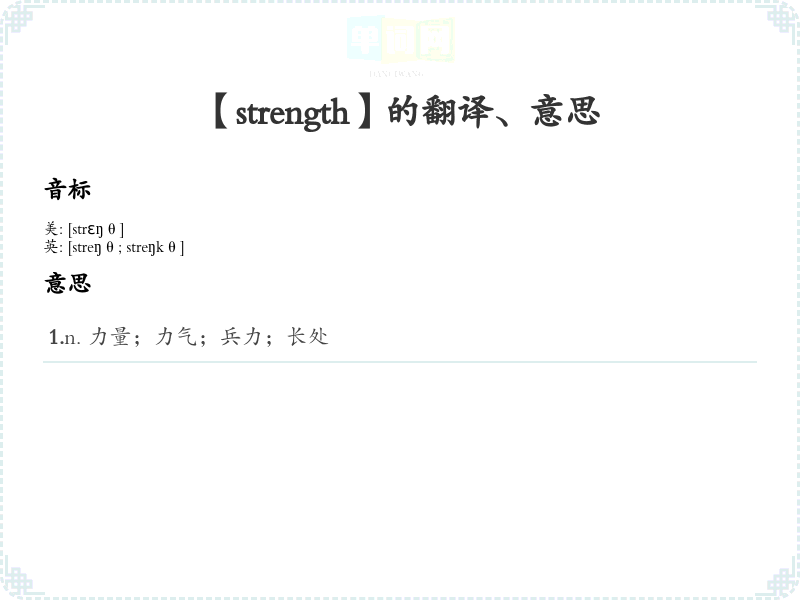 - 字面意思:strength 意为“力量”或“强度”,可以指身体的力量、精神的力量或物质的强度。